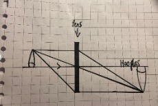 Om te beginnen wat betekent convergent? Convergent betekent dat iets naar elkaar toe gaat, dus in dit geval betekent dat de lichtstralen niet uit elkaar maar naar elkaar toe lopen. Zoals u hierboven op de constructietekening kan zien gaan de lichtstralen door de lens en worden die convergent afgebroken en dus gaan de lichtstralen naar elkaar toe. Het beeld dat gevormd wordt is dan groter en ondersteboven.
