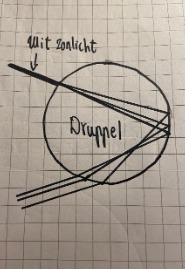 In het afbeelding hieronder ziet u hoe een regenboog ontstaat, het witte zonlicht schijnt in de druppel, waar je vervolgens het prisma-effect krijgt (witte zonlicht opsplitst zich in verschillende kleuren) en doordat het licht tegen de achterkant van de druppel niet alleen naar beneden weerkaatst maar ook in een cirkel krijg je dus een boog.